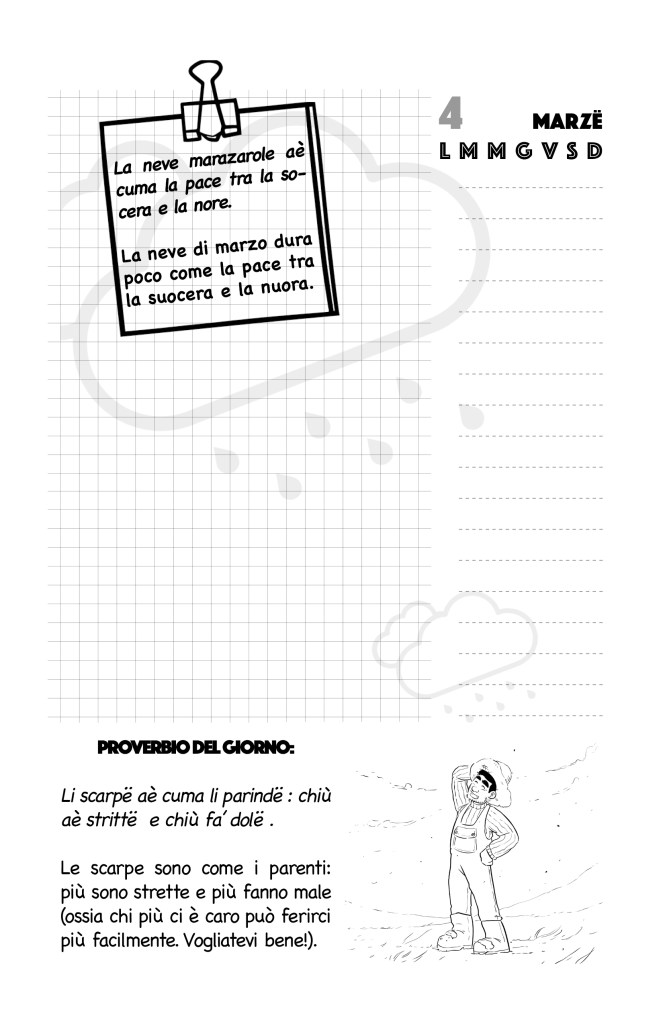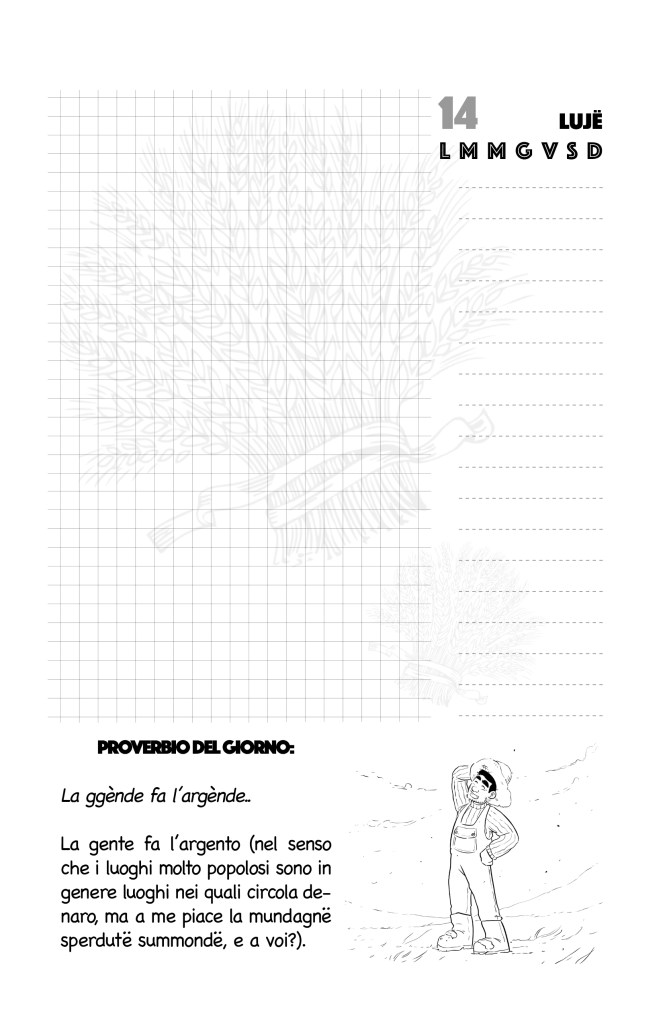 Nanno’, mi raccomando: scine ‘cà scine… Quante volte abbiamo ascoltato queste parole dai nostri nonni e, quanto spesso, abbiamo potuto constatare che le raccomandazioni contenute nei proverbi rivelatici da genitori, vecchi amici o anziani del paese fossero infinitamente più illuminanti di tutte le massime di Osho e degli insegnamenti del Buddha messi assieme? Non sarebbe meraviglioso se tutte queste preziosissime perle di saggezza potessero accompagnarci lungo il corso dell’anno, come un faro nel buio? Da oggi questo sogno diventa realtà! L’Agenda Agricola Abruzzese risponde a quest’atavica esigenza regalandoci una preziosa perla di saggezza 365 giorni l’anno! Una compagna fedele che troveremo sempre dove ci aspettiamo sia, come una commare ‘Ngiulina o un compare Peppe alle poste, a prescindere se sia o meno il giorno della pensione. E, proprio come loro, ogni giorno ci accoglierà con una parola di conforto, un cazzijatone o un saggio consiglio, lasciandoci sempre più certezze che dubbi. L’Agenda Agricola Abruzzese: il diario che sapevi di volere e del quale non potrai fare a meno!