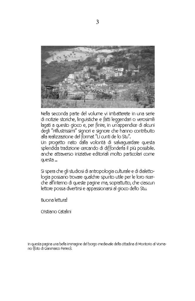 Inoltre, nelle varie appendici, molte curiosità sulla storia, la cultura, gli usi e i costumi delle genti d’Abruzzo, con un occhio di riguardo alla cittadina di Montorio al Vomano, palcoscenico sul quale si muovono gli attori di questa originalissima commedia che è Li Cunti de lo stu!
